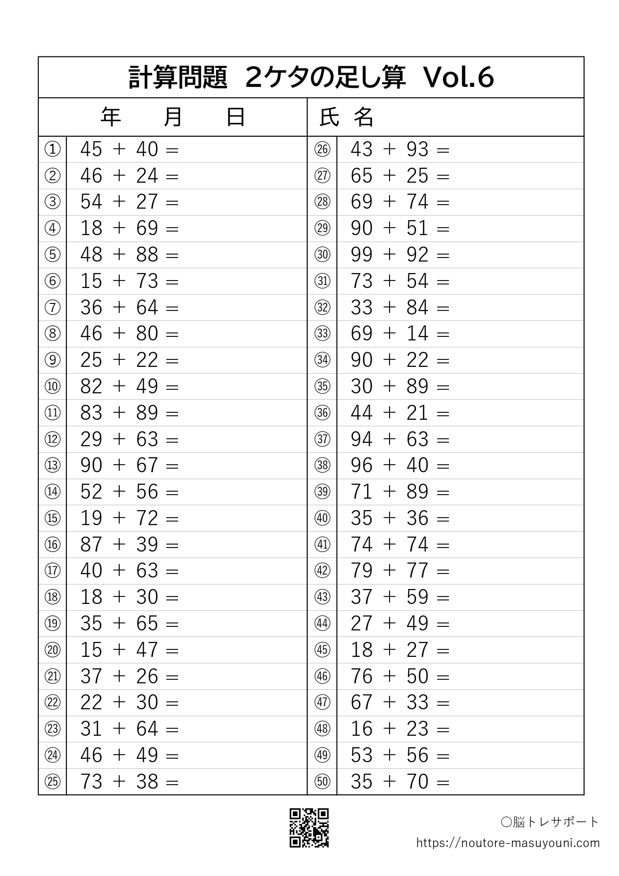 たし算 2ケタ 50問 Vol.6 2024.10.13 ○計算問題をご用意しました。プリント・解答ボタンにて印刷可能です。 たし算2ケタ 50問(問題) プリントボタンを押し印刷してください。 プリント たし算2ケタ 50問(解答) 解答ボタンを押し印刷してください。 解 答 ○プリントについて当サイトのプリントは全て無料です。高齢者、お子様、施設などの利用にお役立てください。○著作権について他サイトでの再配布や譲渡、複製、販売等は一切禁止とさせていただきます。