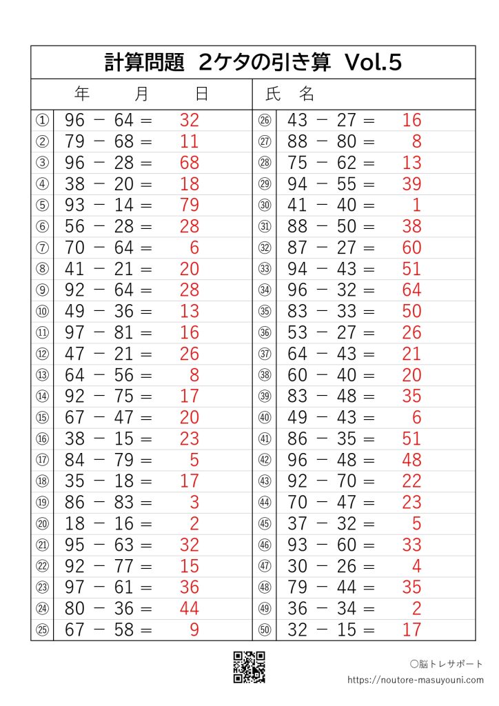 ひき算 2ケタ 50問 Vol.5 2024.10.11 ○計算問題をご用意しました。プリント・解答ボタンにて印刷可能です。 ひき算2ケタ 50問(問題) プリントボタンを押し印刷してください。 プリント ひき算2ケタ 50問(解答) 解答ボタンを押し印刷してください。 解 答 ○プリントについて当サイトのプリントは全て無料です。高齢者、お子様、施設などの利用にお役立てください。○著作権について他サイトでの再配布や譲渡、複製、販売等は一切禁止とさせていただきます。