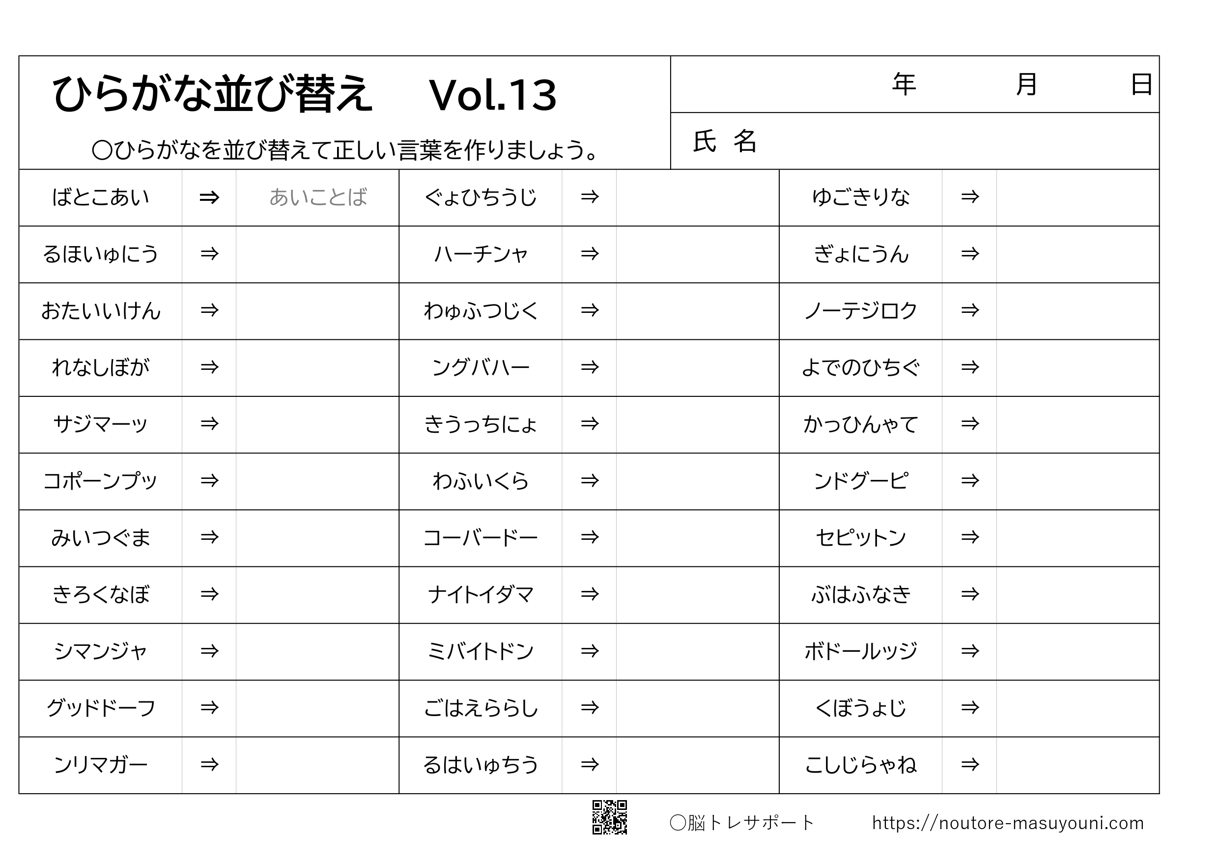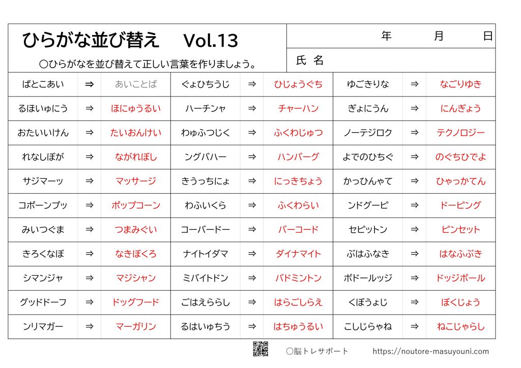 ひらがな並び替え Vol.13 2024.10.30 ○ひらがなを並べ替えて正しい言葉を作りましょう。プリント・解答ボタンにて印刷可能です。 ひらがな並び替え(問題) プリントボタンを押し印刷してください。 プリント ひらがな並び替え(解答) 解答ボタンを押し印刷してください。 解 答 ○プリントについて当サイトのプリントは全て無料です。高齢者、お子様、施設などの利用にお役立てください。○著作権について他サイトでの再配布や譲渡、複製、販売等は一切禁止とさせていただきます。