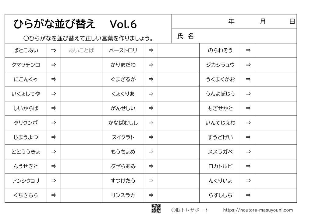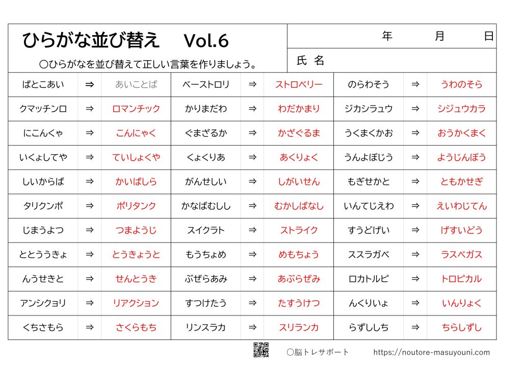 ひらがな並び替え Vol.6 2024.10.13 ○ひらがなを並べ替えて正しい言葉を作りましょう。プリント・解答ボタンにて印刷可能です。 ひらがな並び替え(問題) プリントボタンを押し印刷してください。 プリント ひらがな並び替え(解答) 解答ボタンを押し印刷してください。 解 答 ○プリントについて当サイトのプリントは全て無料です。高齢者、お子様、施設などの利用にお役立てください。○著作権について他サイトでの再配布や譲渡、複製、販売等は一切禁止とさせていただきます。
